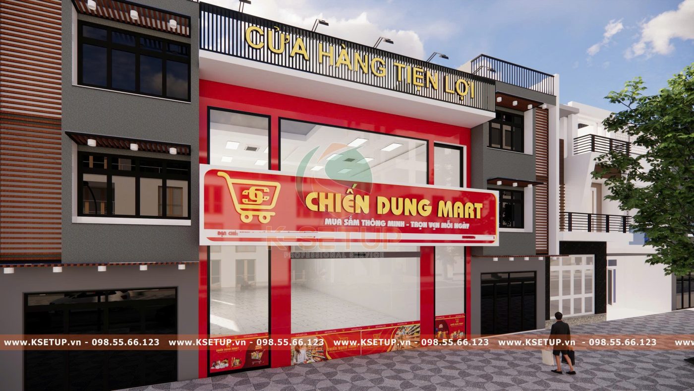Trong thiết kế 3D siêu thị Chiến Dung, đội ngũ chuyên gia thiết kế của K-Setup lựa chọn tone đỏ làm màu chủ đạo nhằm tạo điểm nhấn mạnh mẽ về thị giác và cảm xúc. Màu đỏ không chỉ gợi sự năng động, nhiệt huyết mà còn có khả năng kích thích hành vi mua sắm – một yếu tố tâm lý quan trọng trong ngành bán lẻ. Kết hợp với ánh sáng hợp lý và bố cục không gian khoa học, sắc đỏ giúp tổng thể siêu thị trở nên nổi bật, dễ nhận diện từ xa, đồng thời ghi dấu ấn thương hiệu rõ nét trong lòng khách hàng địa phương.