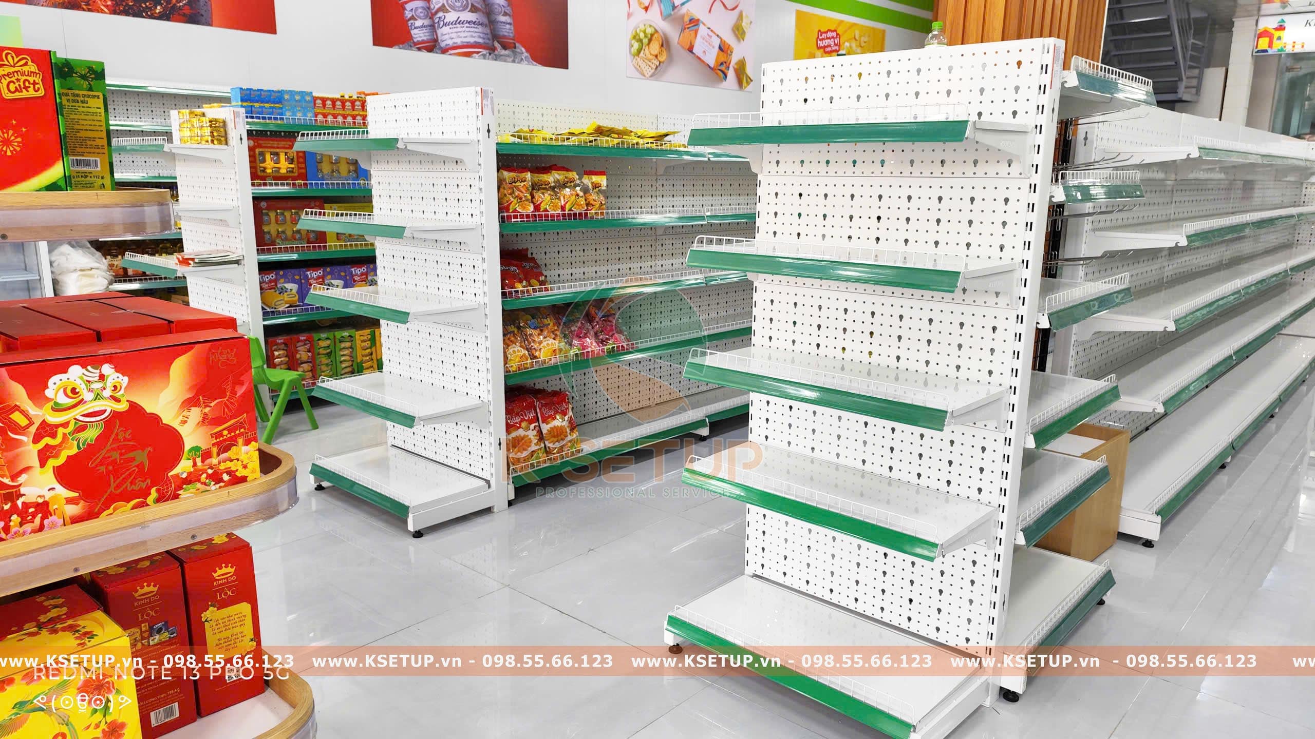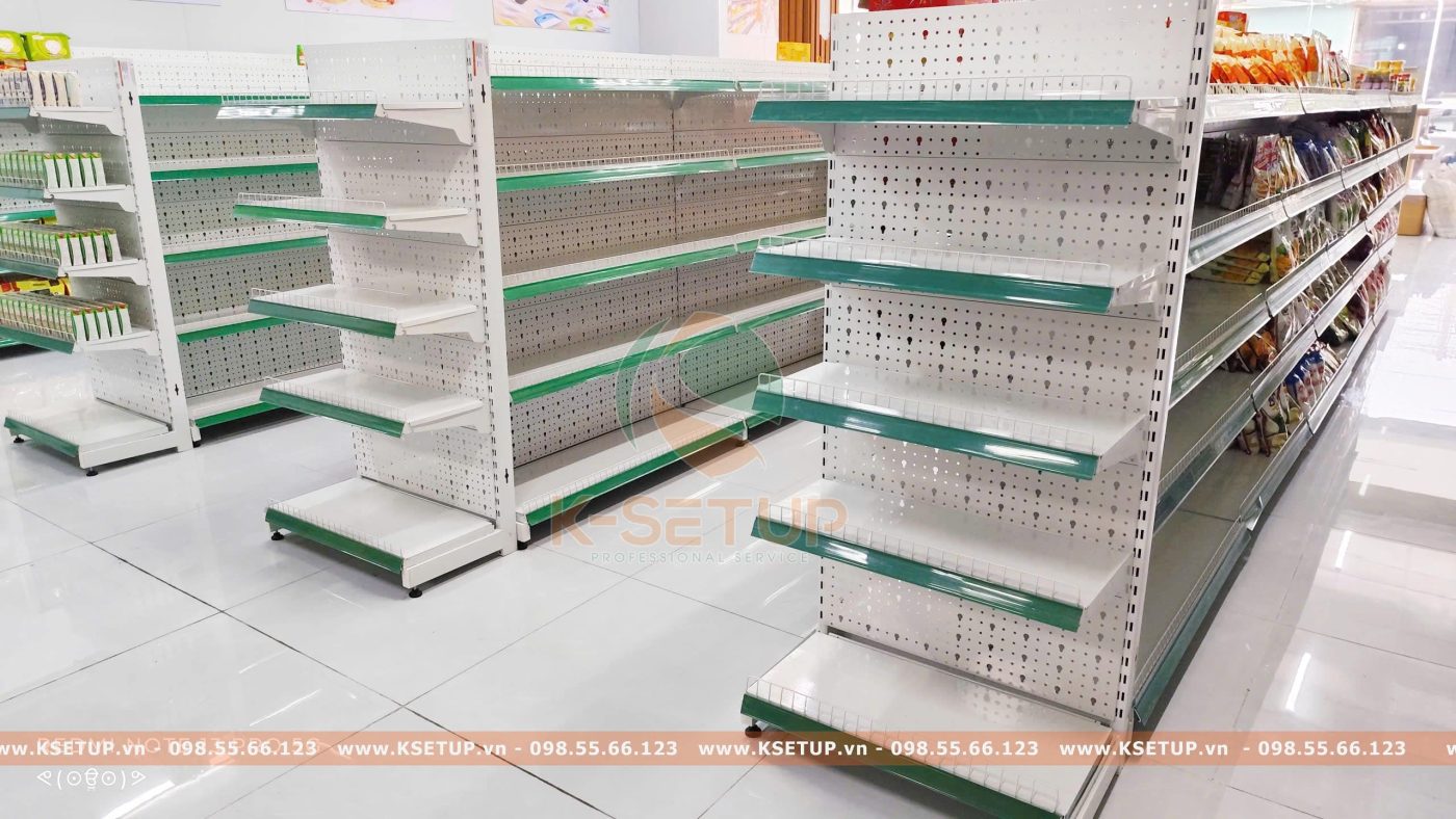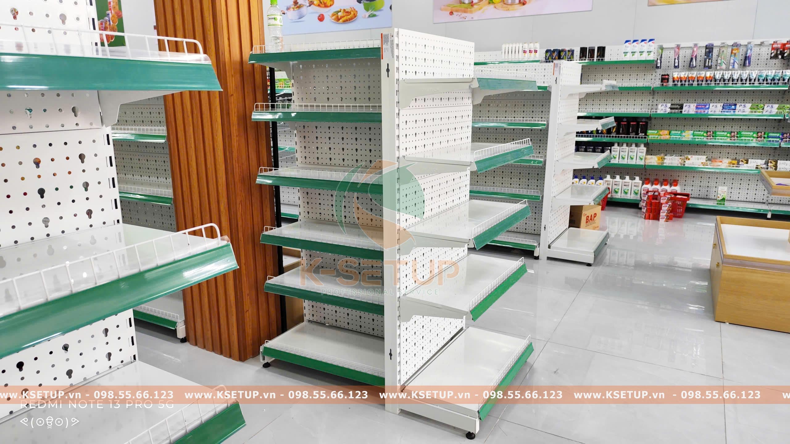 Siêu thị Thảo Nguyên Xanh được thiết kế bộ nhận diệu với tông màu xanh lá chủ đạo. Vì thế, K-Setup cũng đã vô cùng khéo léo khi lựa chọn hệ thống giá kệ trắng nẹp giá xanh giúp siêu thị được đồng bộ, hài hòa và đảm bảo tính thẩm mĩ chung.