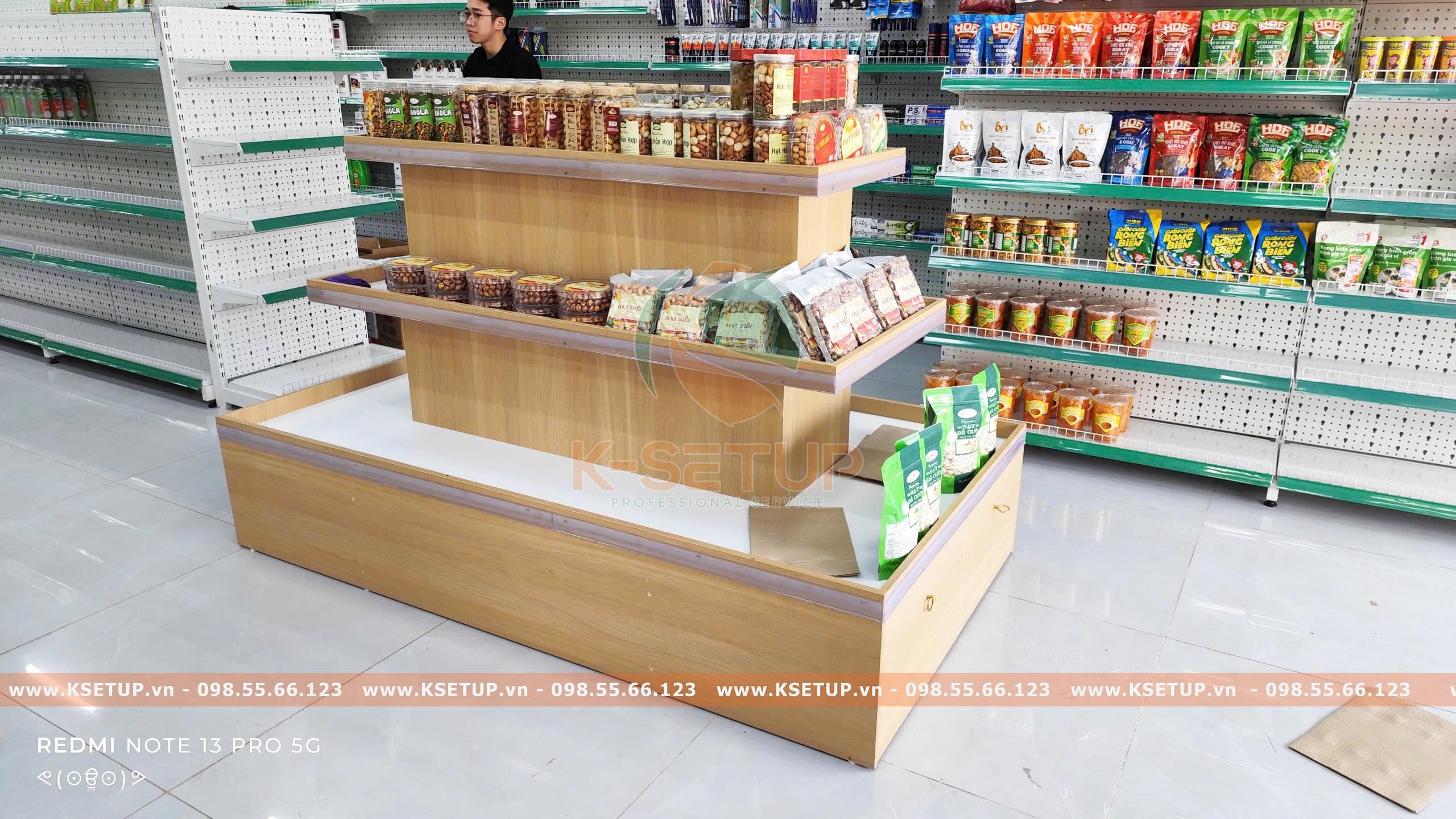 Không chỉ dừng lại ở hệ thống giá kệ siêu thị tiêu chuẩn, K-Setup còn thiết kế riêng hệ thống kệ nội thất cho siêu thị Thảo Nguyên Xanh. Toàn bộ nội thất được lựa chọn từ chất liệu gỗ bền đẹp, gam màu gỗ sáng tinh tế, góp phần tôn lên không gian mua sắm trẻ trung, hiện đại và giàu sức sống cho toàn bộ siêu thị.