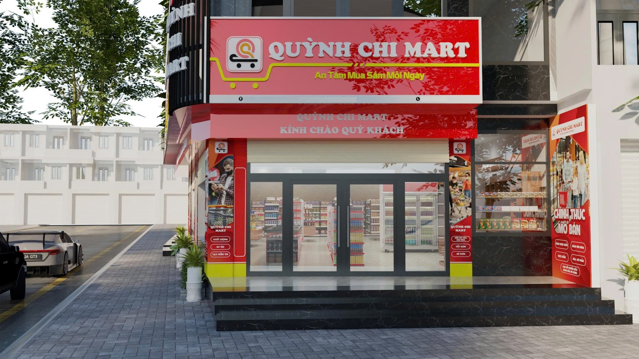 Thiết kế mặt tiền Quỳnh Chi Mart nổi bật với màu đỏ chủ đạo, tạo cảm giác năng động, thu hút và dễ nhận diện từ xa. Giải pháp thiết kế 3D siêu thị giúp thể hiện rõ tổng thể mặt đứng, bố cục biển bảng hài hòa và đồng bộ. Các chi tiết được sắp xếp khoa học, phù hợp với phong cách xây dựng mặt bằng hiện trạng. Tổng thể thiết kế mang tính khác biệt, đổi mới, góp phần nâng cao hình ảnh thương hiệu và hiệu quả kinh doanh.