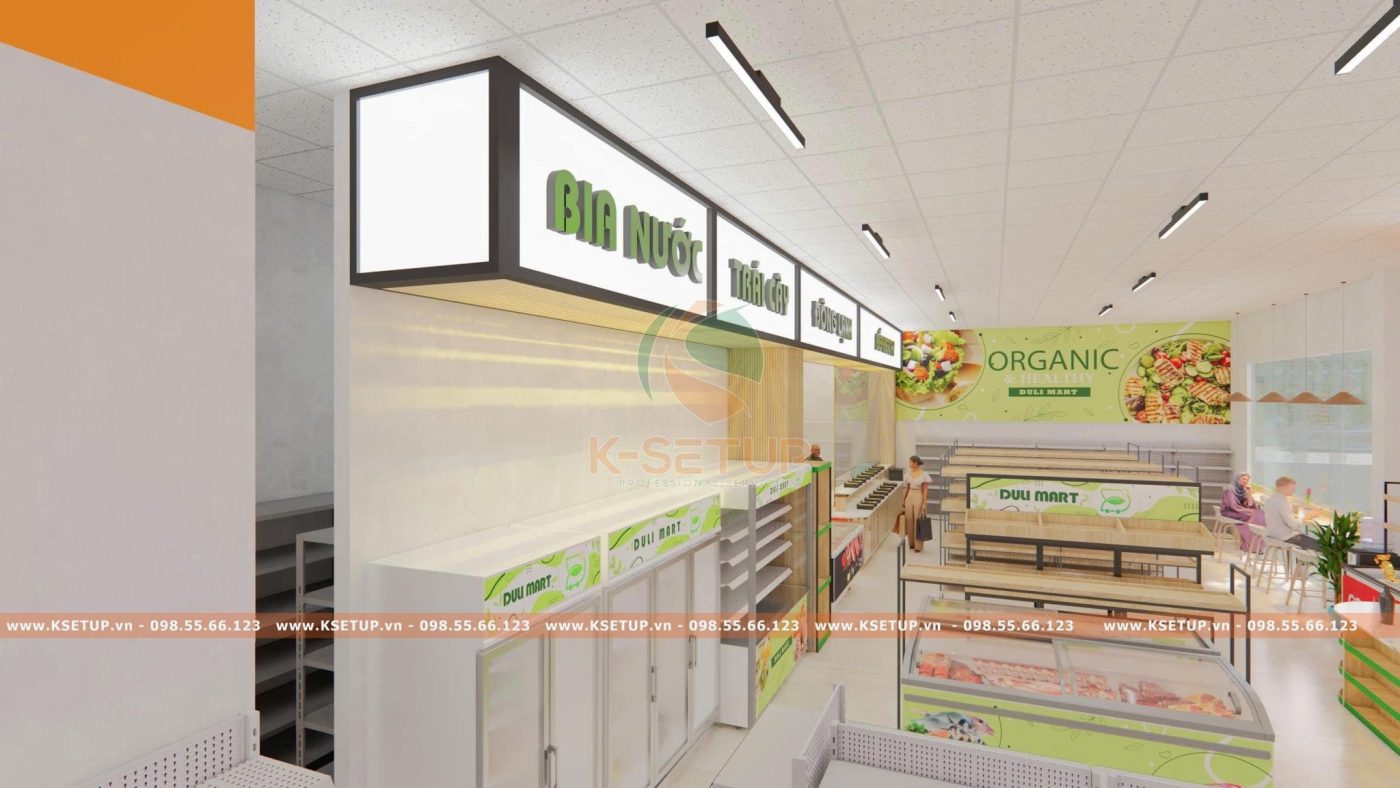 K-Setup lưu ý: nhiệt độ màu đồng bộ với nhận diện thương hiệu. Ví dụ, siêu thị mini theo tông xanh lá có thể dùng ánh sáng trắng trung tính pha vàng ấm để cảm giác gần gũi.